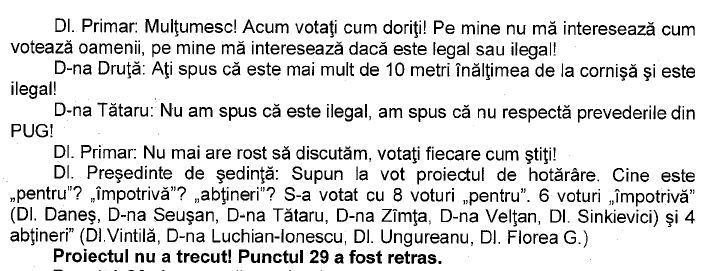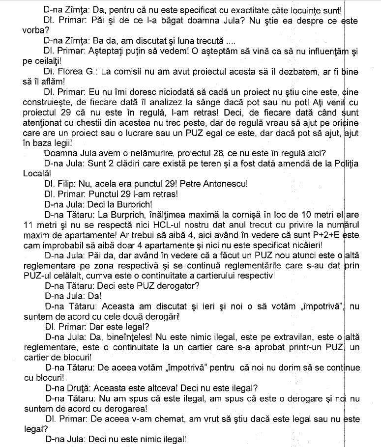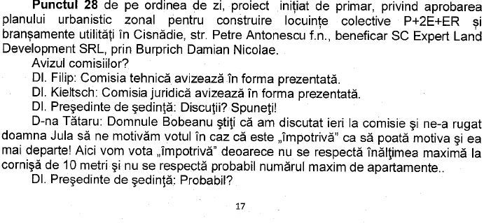 In concluzie, la momentul respectiv, consilierii locali USR, Pro România și PSD au decis că nu sunt de acord să deroge de la P.U.G. și să nu respecte numărul maxim de apartamente, votând împotriva adoptării P.U.Z.-ului.